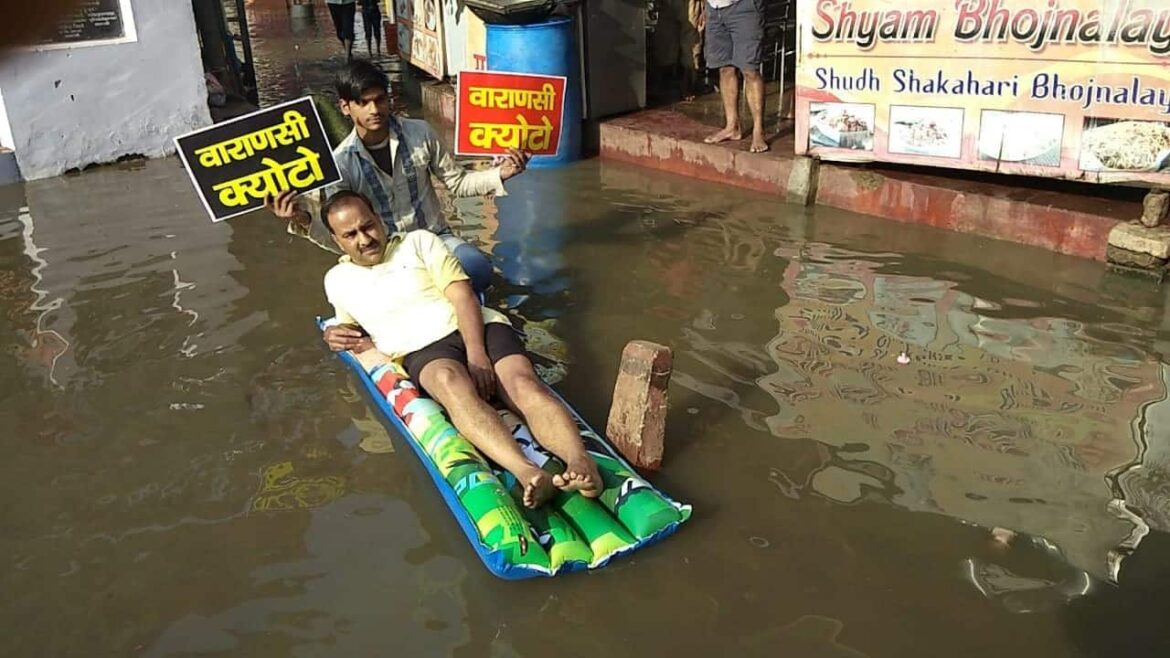 पार्षद प्लास्टिक के बाथटब पर खुद लेट कर व्यंग्यात्मक लहजे में वाराणसी क्योटो बन गया के पोस्टर के साथ विरोध प्रदर्शन करने लगा. इस काम में उनके एक साथी भी शामिल हुए, जो पोस्टर को लेकर बैठे दिखे.